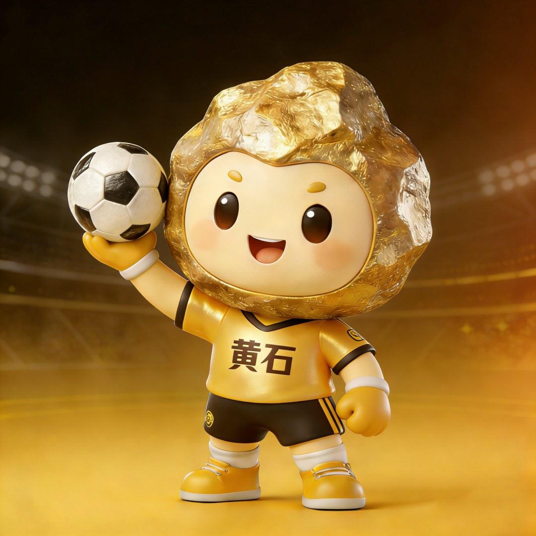 其中,吉祥物“黄金金”以“点石成金”为核心创意,深度呼应黄石“矿冶文化之都”的深厚历史底蕴,其头顶与额前区域以棱角分明的金属质感造型模拟矿石结晶的自然形态,既勾勒出灵动的头部轮廓,又直观呼应“点石成金”的创意内核。“金”字不仅象征着胜利、荣耀与希望,更寄托着黄石市足球队在赛场上争创佳绩的美好期许,以及黄石市足球事业蓬勃发展、蒸蒸日上的坚定信念。