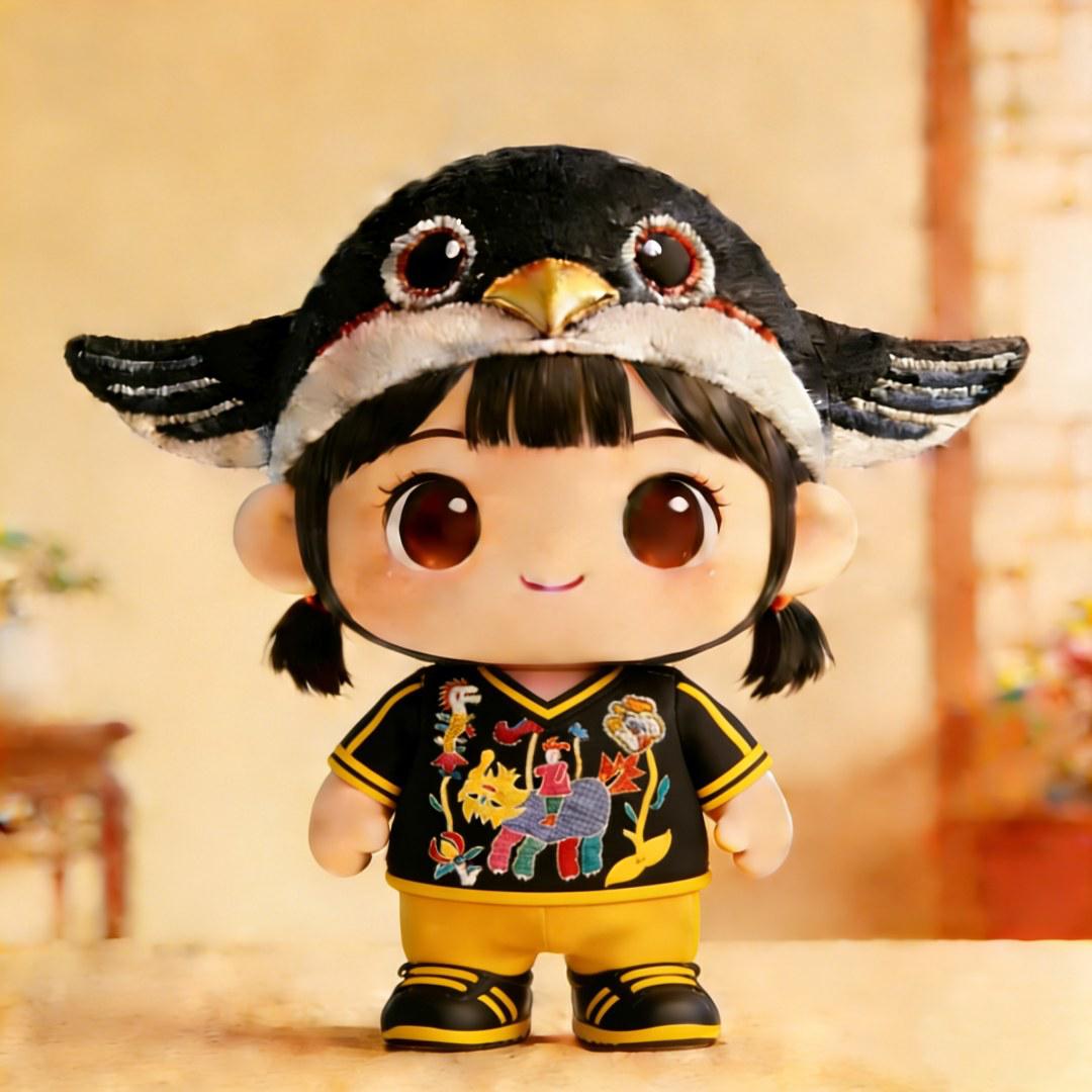 另一款吉祥物“石小燕”则紧扣黄石市作为经典儿歌《小燕子》起源地的独特文化标签,恰似穿梭在黄石山水间的春燕,传递着灵动、喜乐与生机的美好寓意。其服饰巧妙提取国家级非物质文化遗产阳新布贴的经典纹样,黑底衬色、浓墨重彩的设计,既让古老的民间艺术在绿茵场上焕发新生,更为城市文旅推广、文创周边开发、公益宣传等领域留下了广阔的想象空间,让黄石地域传统文化的独特魅力借“楚超”赛事的东风,走进更多人的视野。