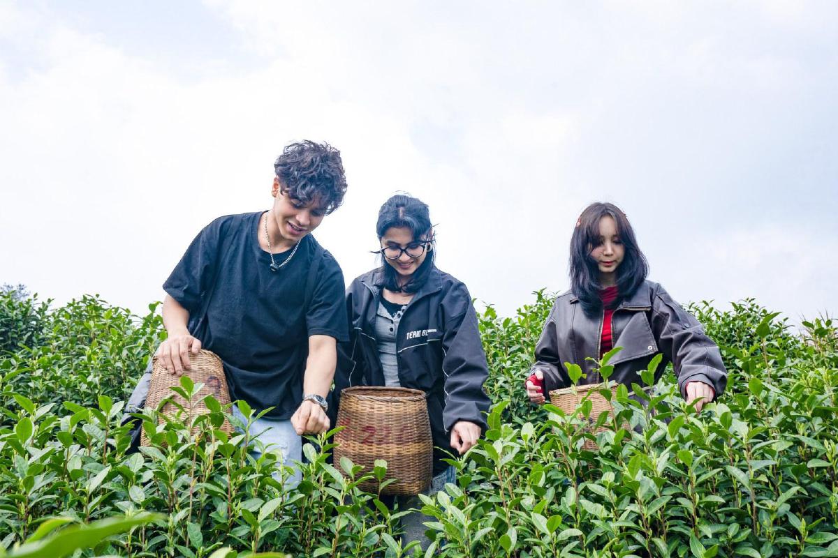 李明学着肖文斌的样子,小心翼翼地摘下一片嫩芽,放在鼻尖嗅闻,他瞪大眼睛,惊讶地说:“原来新鲜茶叶是这种味道,太好闻了!”金月、金星在旁边,一边学着采摘,一边用手机记录下这一切。