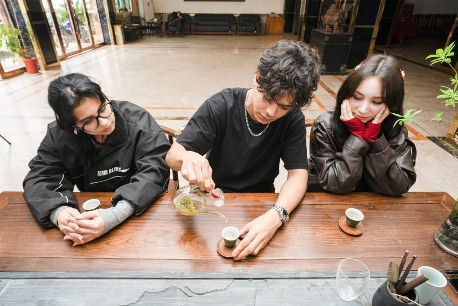 金月端着茶杯,轻轻抿了一口,说道:“在我们国家塔吉克斯坦,我们煮茶的时候会加一点盐和牛奶。”金星点点头,接过话茬:“对,我们喝的茶是深色的,味道比较浓。”她晃了晃手里的茶杯,接着说:“像这种清亮的绿茶,我从来没有喝过,我非常喜欢!”