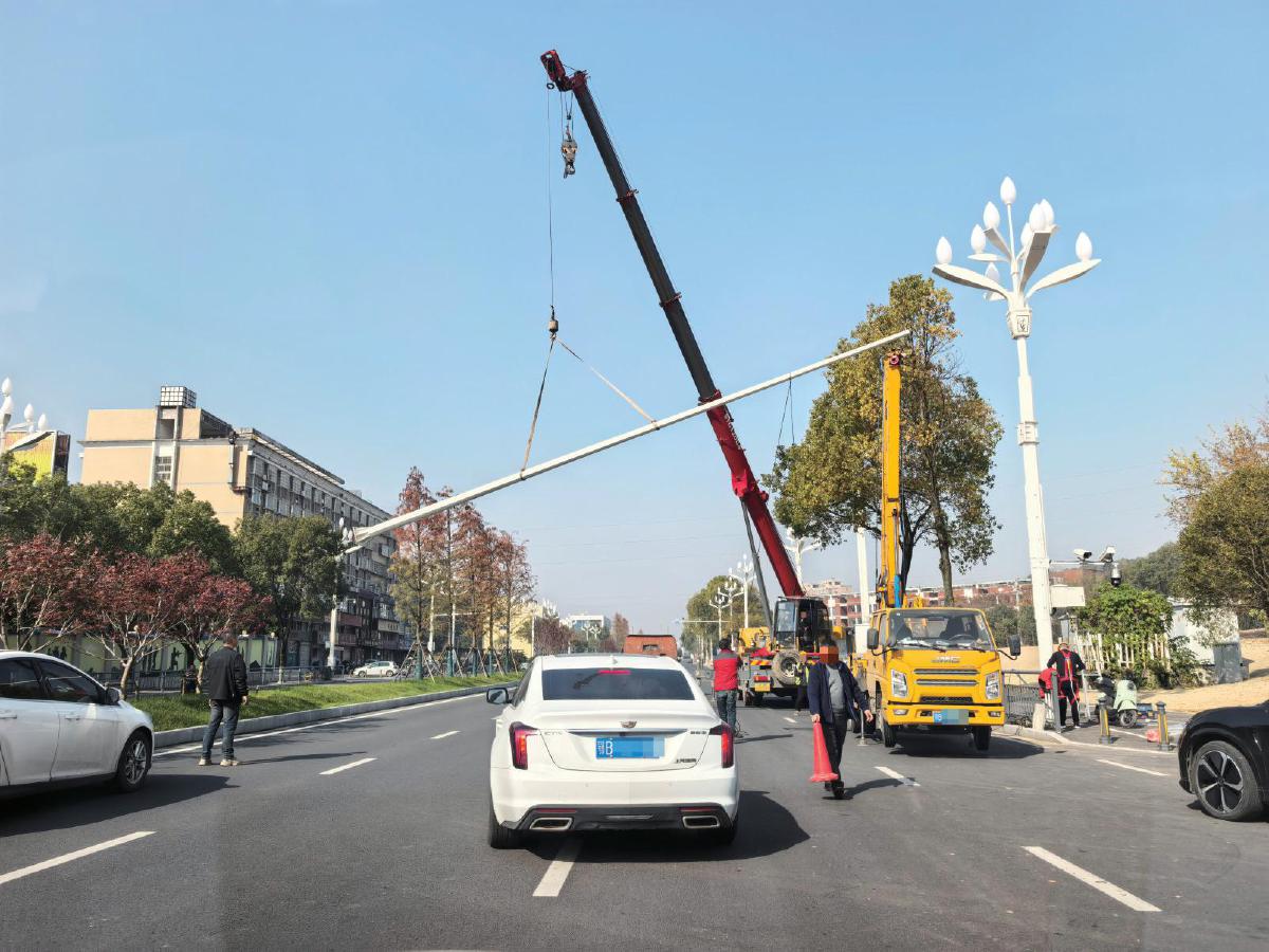 当天上午11时左右,有市民反映,在下陆区复兴大道武警支队路段,有施工方使用吊车拆卸设置在路灯杆上的横杆,导致原本四车道的道路仅剩一条车道可通行,车辆通行受阻。