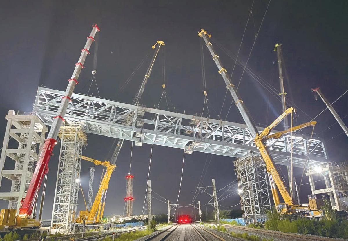 2025年8月,当地气温直逼40℃。为抢抓铁路部门批准的短短数日施工窗口,项目部创新采用“化整为零、空中组对”方案——将整桥分成3段,动用4台巨型吊车协同作业,在铁道上空“拼积木”。