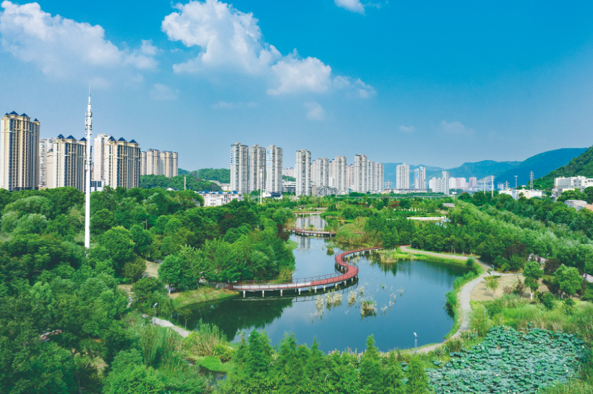 30日,蓝天白云之下,磁湖湿地公园四周楼群成片。近年来,我市着力打造环磁湖景观带,逐渐建成集生态、休闲、商业、城市公共生活为一体的生态乐居环境,市民幸福指数有了很大提高。