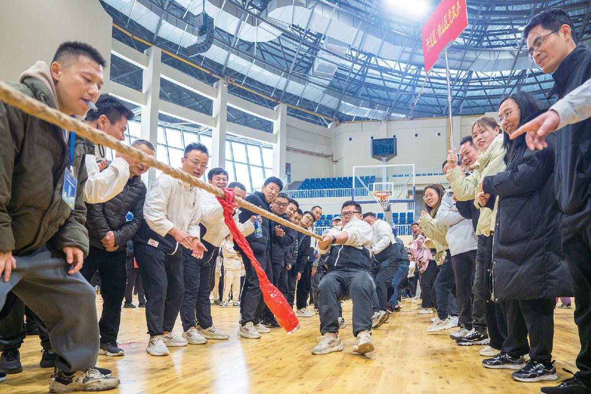16日,黄石市党办系统第四届趣味运动会在湖北工程职业学院体育馆举行。图为拔河比赛现场。 记者 李航 摄