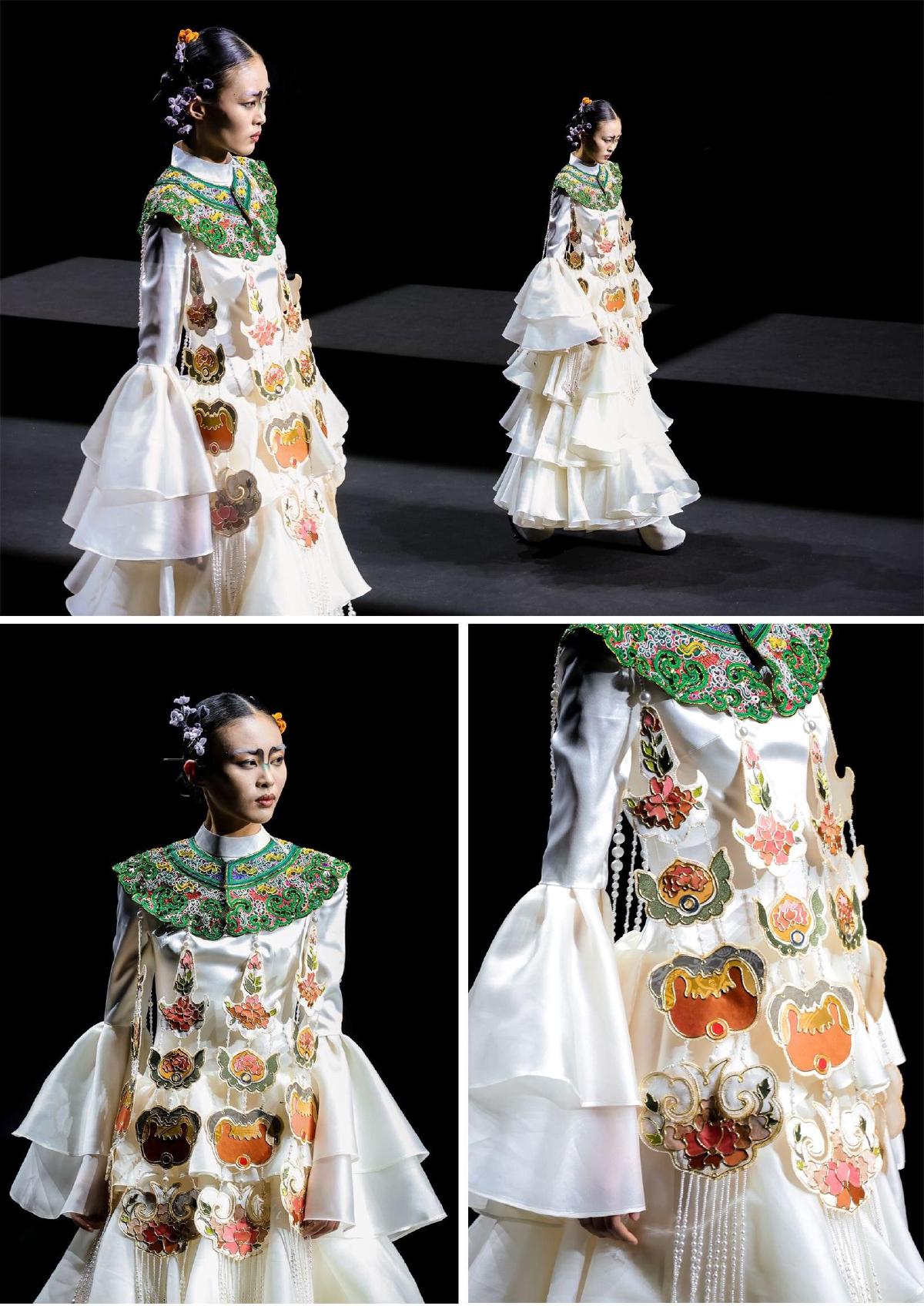 “鋆棠·传说”灵感来源于民间传说,将阳新布贴、绒花、苗绣等传统手工艺与西兰卡普、香云纱、亮布等纺织材质相结合,实现传统与现代相融,让“非遗”好看又好玩。