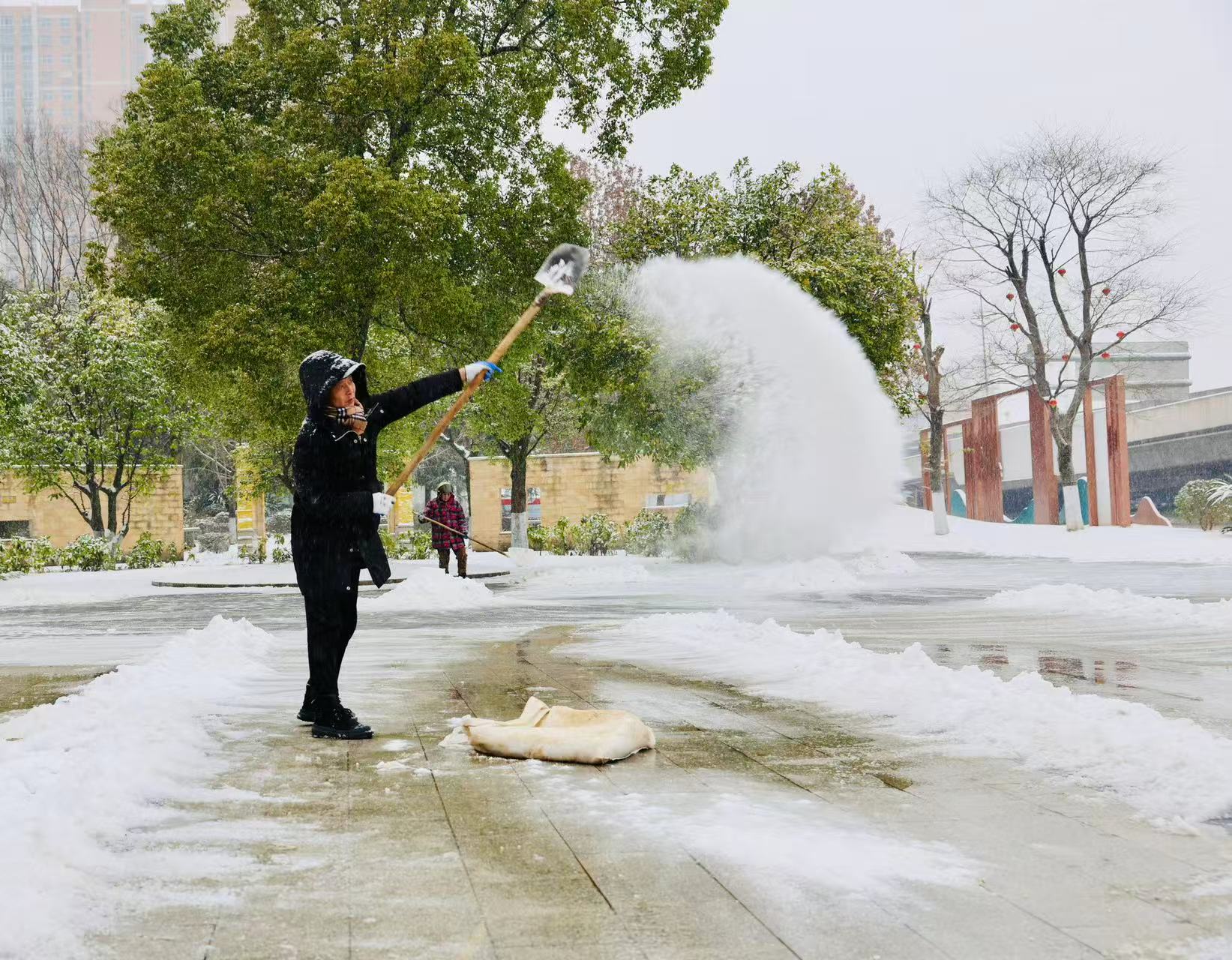 黄石港区城管局组织环卫工人在道路上撒盐溶雪