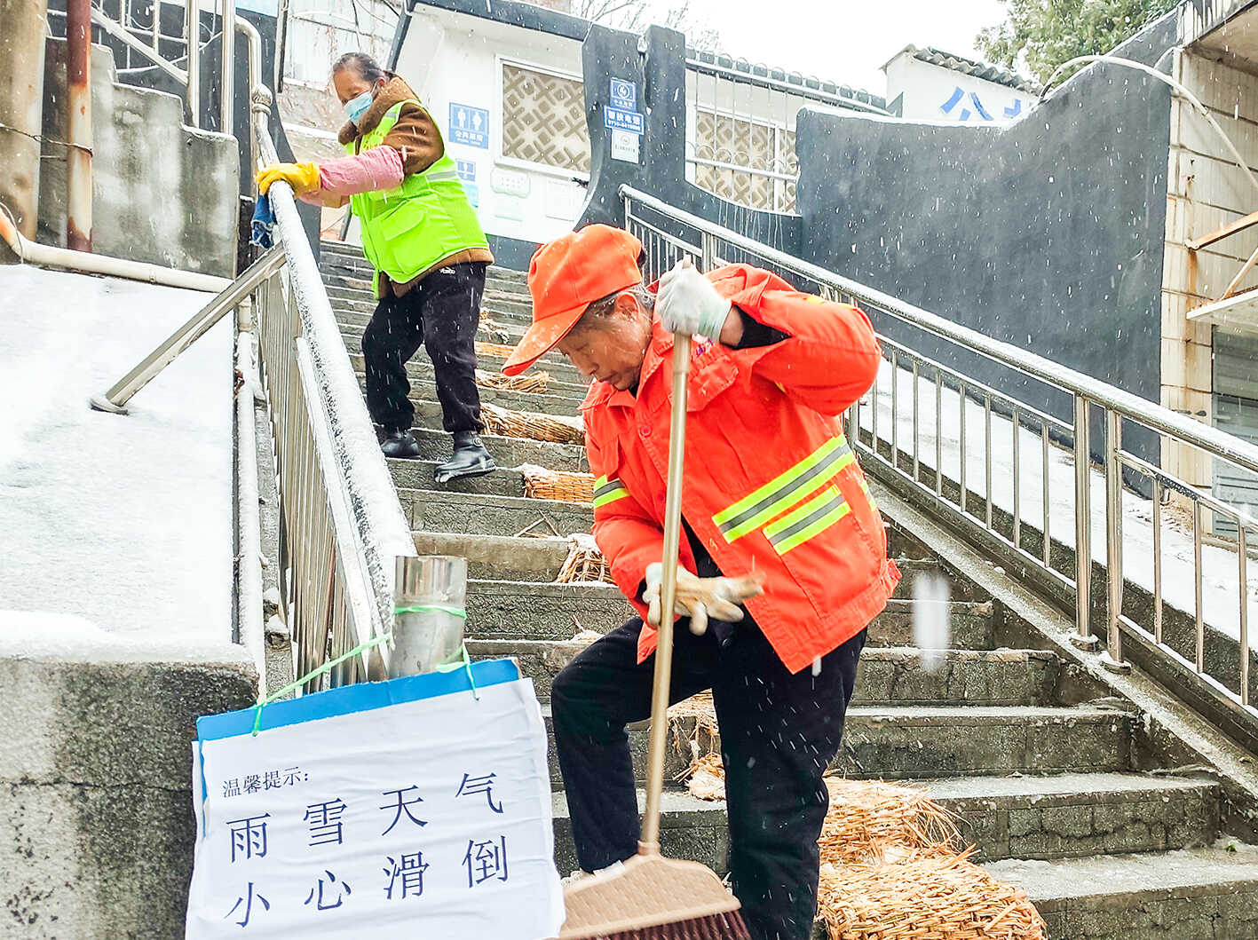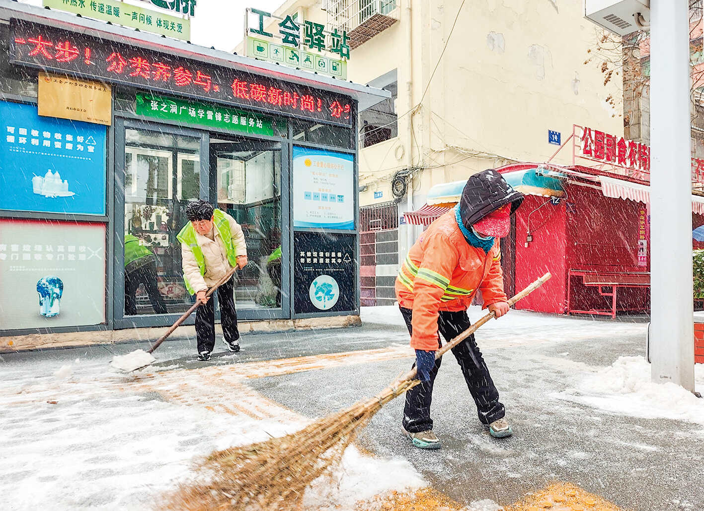 19日,开发区·铁山区城维园林绿化公司员工们街头除雪,让街道在严冬中保持安全与整洁。(黄石融媒记者 鄢巍 通讯员 乐浩 摄)