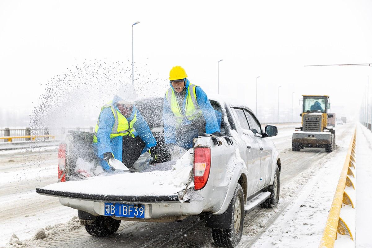 黄石长江公路大桥经营有限公司工作人员向道路抛撒融雪剂。(黄石融媒记者 周巍 摄)
