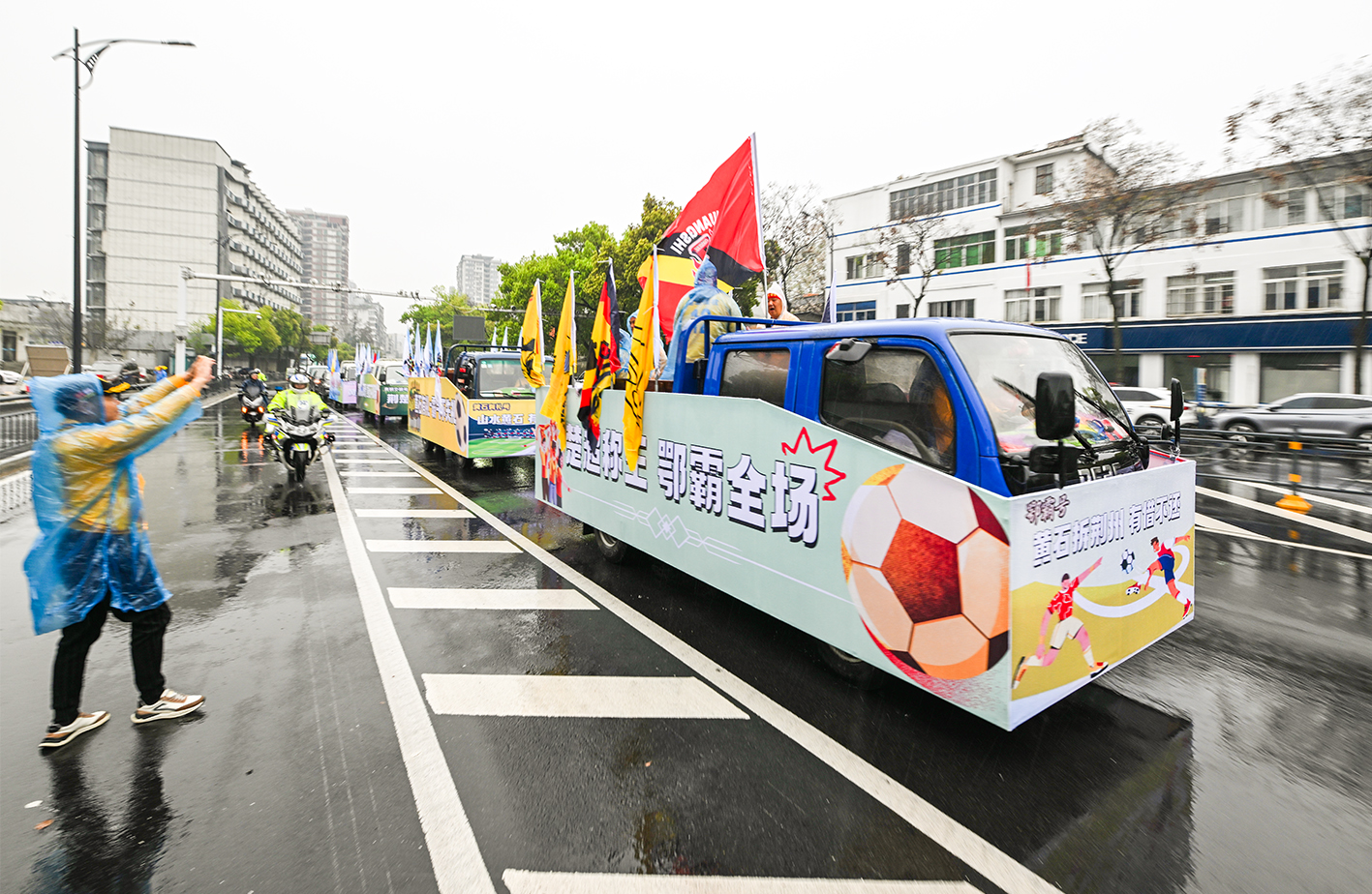 3月31日,黄石市球迷协会在城区启动花车巡游活动,近百名球迷风雨无阻,用热情和呐喊为“楚超”开幕吹响冲锋号。黄石融媒记者 鄢巍 摄