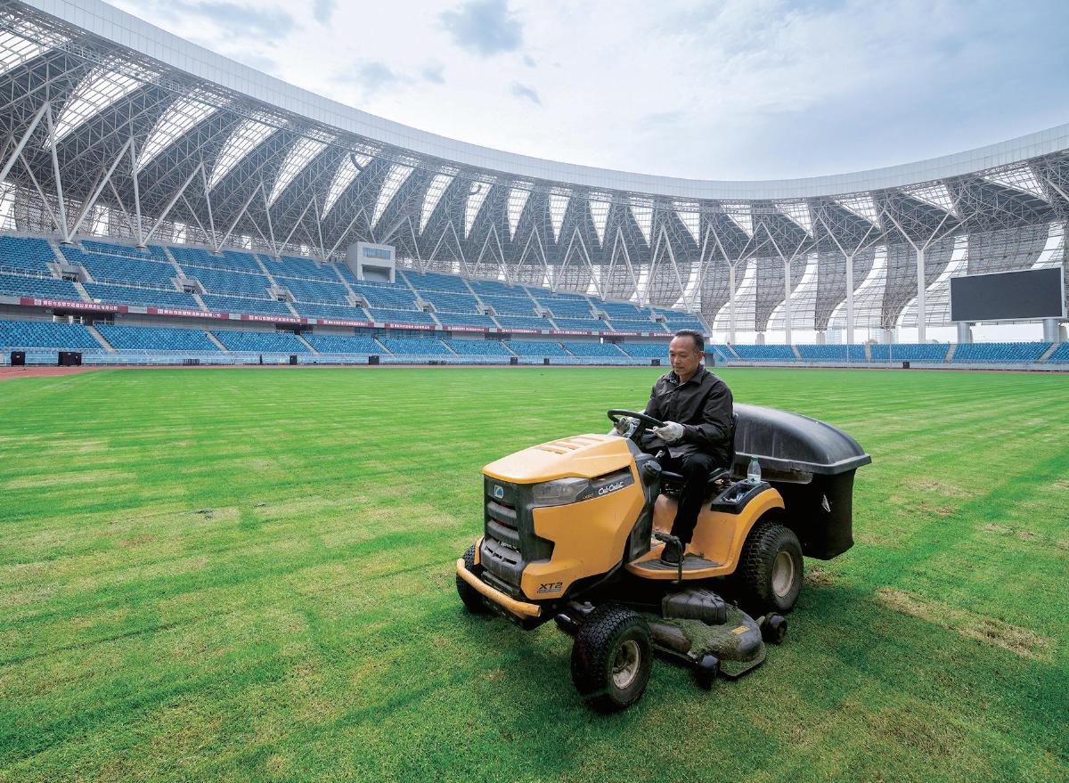 2日,黄石奥体中心体育场内,工作人员操作专业设备对修剪后的草坪进行清理养护。场馆对赛事天然草坪实施精细化管理,保障草坪长势良好,以一流场地条件保障赛事举办。 黄石融媒记者 石勇 摄