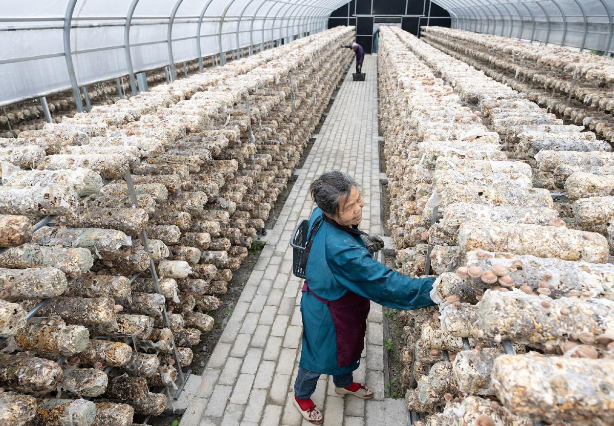 13日,农户在大冶市陈贵镇南山村种植大棚内采摘菌菇。近年来,该村以菌菇种植为主导产业,目前已建成25亩标准化菌菇种植大棚和40亩羊肚菌种植基地,菌菇年产量达45吨。