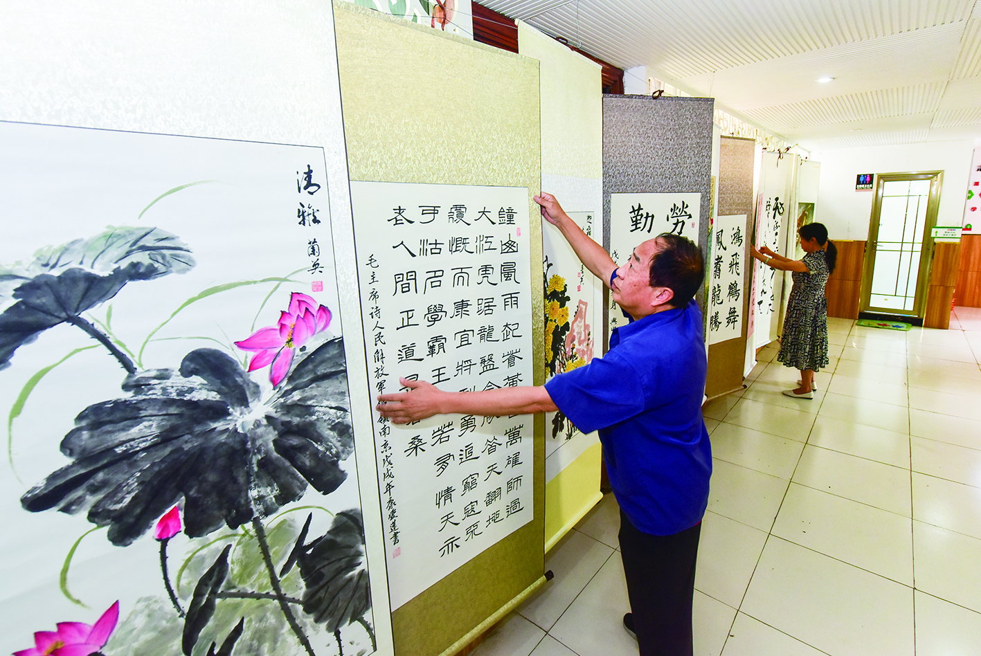 21日,开发区·铁山区胜利路社区举行书画展,展出来自社区书画协会及各界书画爱好者的作品,以此庆祝建党100周年。记者 鄢巍 通讯员 潘晓梅 摄
