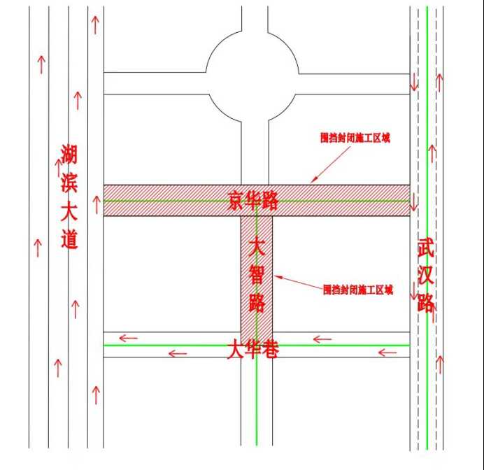1、施工期间,使用围挡封闭京华路全线及大智路(京华路路口-大华巷路口)整幅道路,机动车辆无法通行,非机动车可借道人行道通行。