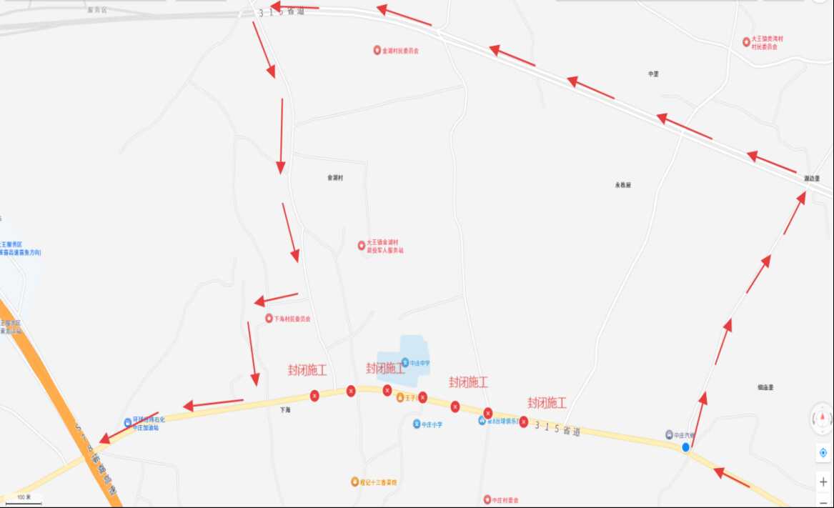 中庄街道段施工绕行示意图