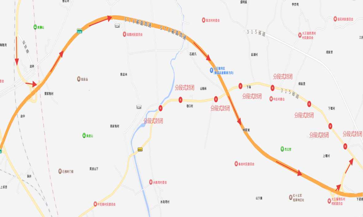 2025年10月26日至2025年11月16日期间,中庄街道段,实行全封闭施工。车辆请从下海村名委员会绕行至新315省道,货车请从大冶东收费站绕行蕲嘉高速至大王收费站。