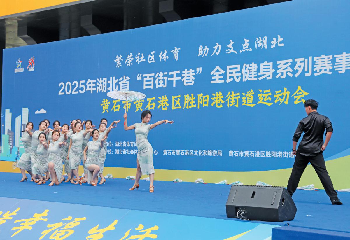 活动以黄石港区社会体育指导员协会的威风锣鼓《欢聚一堂》开场,气势磅礴,展现厚重文化传承。紧随其后,湖北师范大学体育学院的啦啦操《花样健康》活力四射,以张力动作和流畅队形诠释艺术与团队协作。湖北师范大学学子的拉丁舞《青子吟》点燃全场热情,创新融合旗袍与奔放节奏,舞动青春。