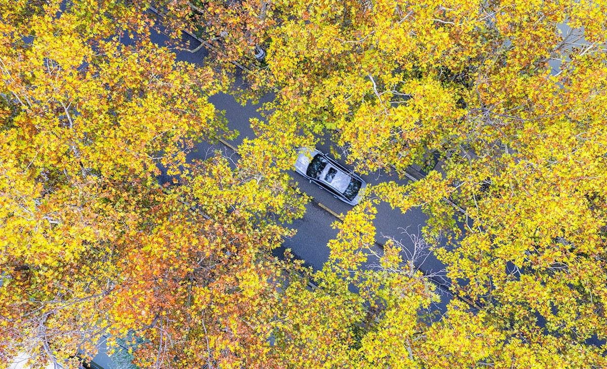 澄月路上,梧桐满树鎏金。夕阳斜照,叶片仿佛被点燃,红、黄、橙交织如梦,与城市楼影、静谧湖面共同织就一幅温暖而丰富的冬日长卷。