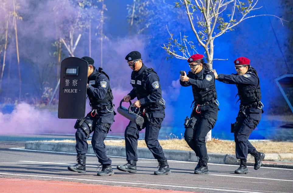 最震撼的当属特警实战汇报表演。随着两颗爆震弹爆裂,烟雾迅速弥漫,4名特警突击队员从高楼索降而下,随即组成4人战术小组,借助滑索穿越障碍。紧接着,队员们切换搜索队形快速推进,破门而入抵达射击地台后,分别以立姿、跪姿举枪瞄准,精准击落前方目标靶,整套动作一气呵成、干净利落。