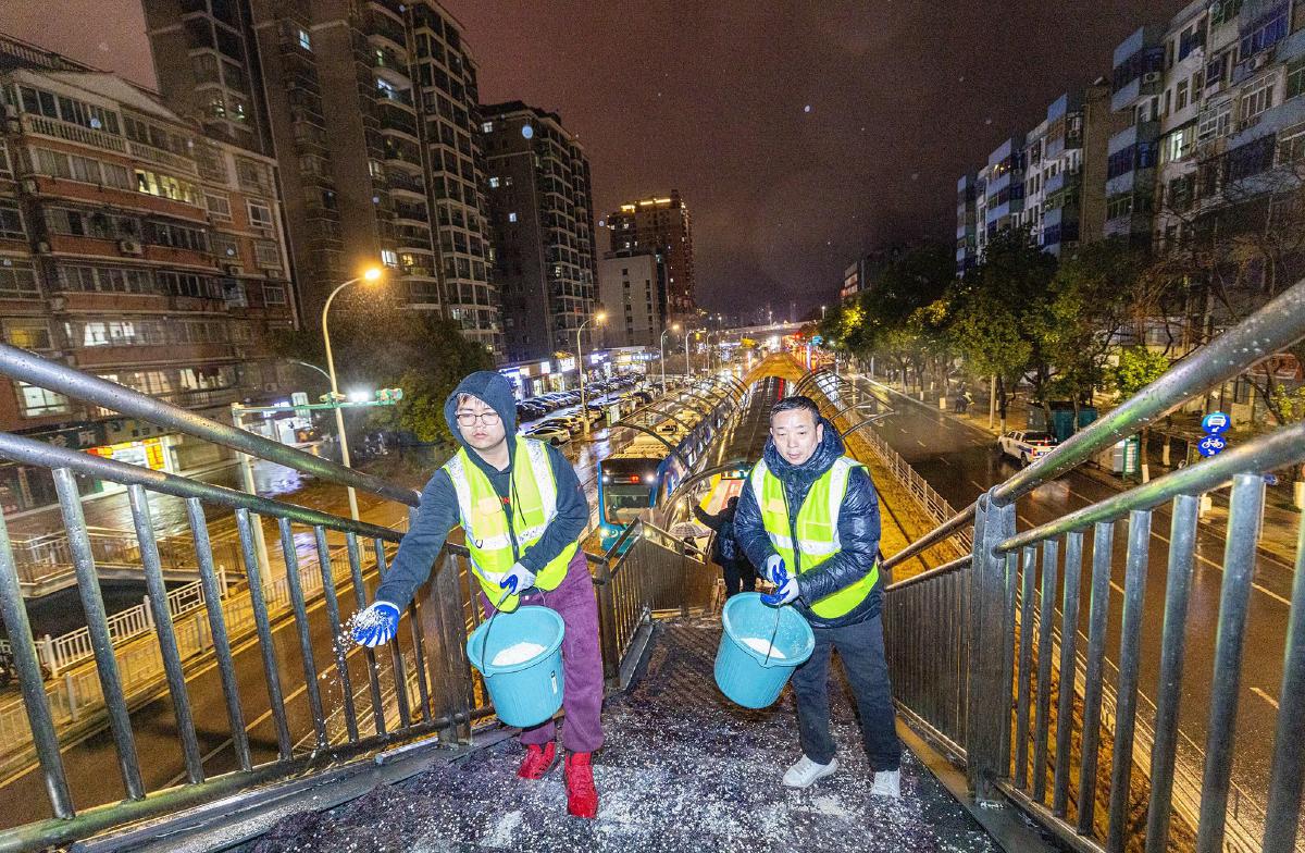 19日晚,市政公用局工作人员在黄石二中天桥楼梯撒融雪剂。为应对低温雨雪天气,黄石市城管委加强对人行天桥梯道、坡道、桥梁等易结冰处的巡查排查,及时消除安全隐患,全力保障市民出行安全与城市平稳运行。 黄石融媒记者 周巍 摄