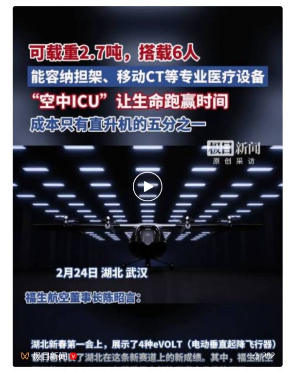 长期以来,地面交通拥堵、复杂地形阻隔、急救资源分布不均,始终是制约医疗应急效率的核心痛点。在此背景下,由于内部空间较大,可以搭载包括移动CT、ECMO等专业医疗设备,Sparrow-X2可以承担“空中ICU”的任务。