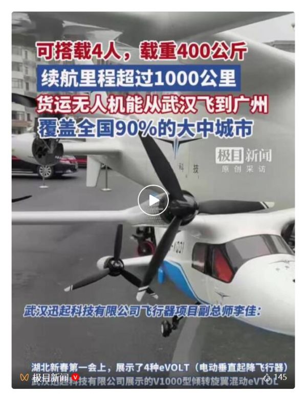 “它对起降场地要求低,具备极高的任务灵活性。”李佳介绍,采用混合动力的V1000具备垂直起降、载重比大、航程远、成本低等特点,多项设计指标对标国际一流,同步按照适航认证标准设计。它续航里程超过1000公里,足以支持它从武汉飞往广州、南京、上海等地,能覆盖全国90%的大中城市,打破短途飞行的里程焦虑。