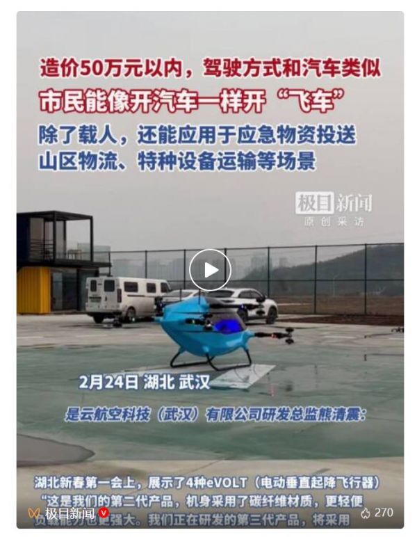熊清震说,为了让普通人也能圆飞行梦,他们希望将新产品的单价控制在50万元以内。同时,他们还在研发适合在水面起降的产品,将来可以应用于公园、湖面等场景,让更多的普通市民也能体验飞行的乐趣。