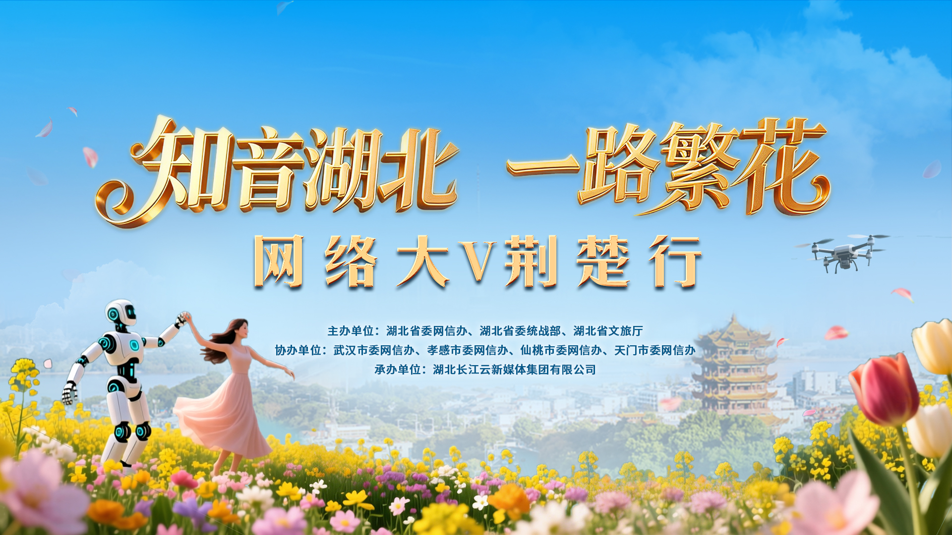 本次活动由湖北省委网信办、湖北省委统战部、湖北省文旅厅联合主办,武汉、孝感、天门、仙桃四地市委网信办协办,湖北长江云新媒体集团有限公司承办,活动以春日赏花为切入点,聚焦“新春第一会湖北数智产业”“农文旅融合业态下的区域特色”“荆楚赏花新业态”等主题内容,组织网络大V深入武汉、孝感、天门、仙桃四地,通过航拍、视频、图文、AI等多种创作形态,在网络上掀起湖北赏花传播热潮。