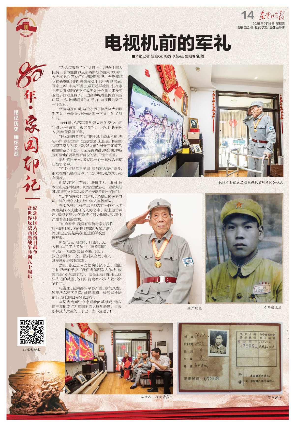 当记者询问张立忠观看阅兵感受,他表情严肃地说:“为祖国的强大感到骄傲。过去那种受人欺凌的日子已一去不复返了!”