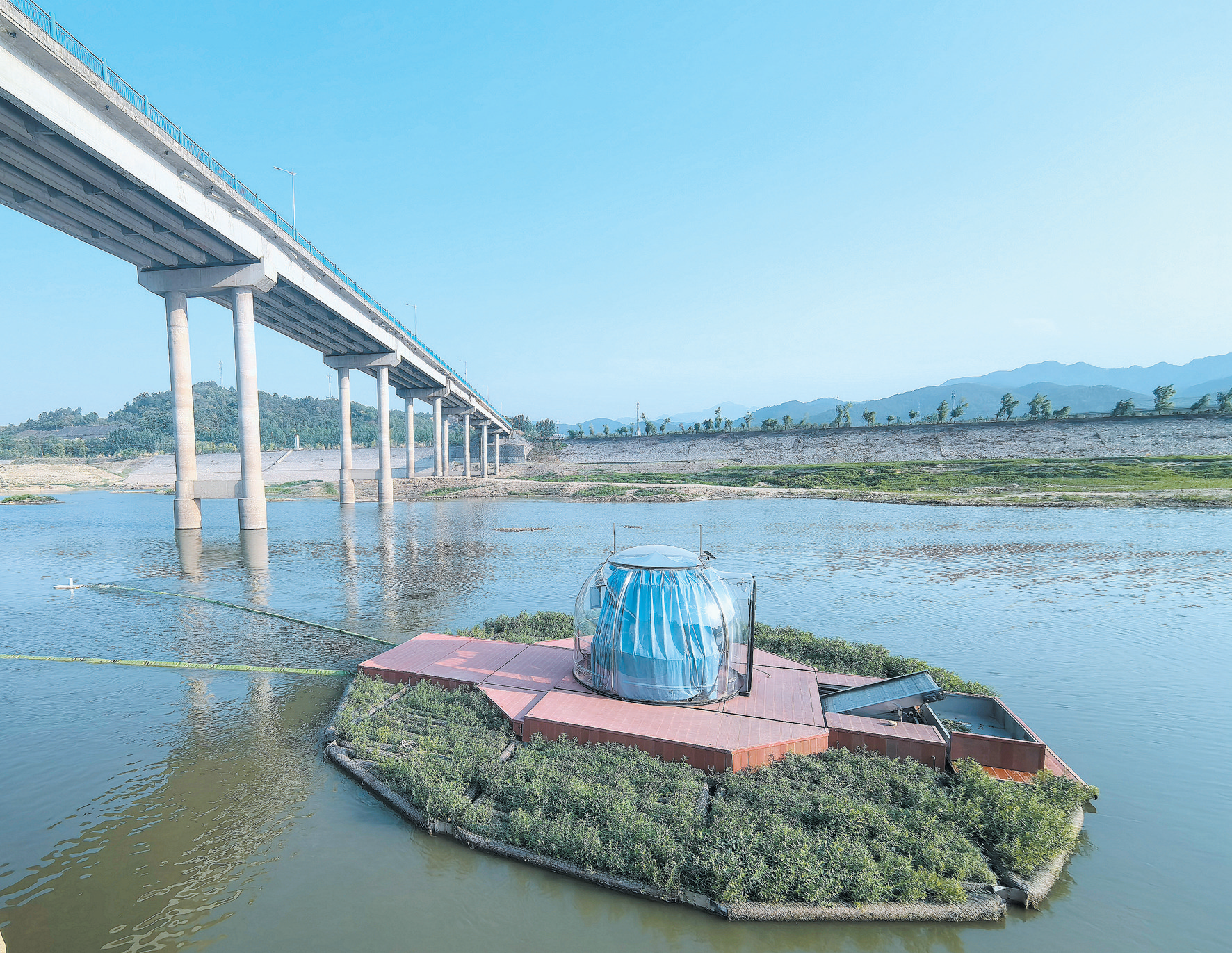 距离马家岗村村部2分钟车程的桥下,一个直径约15米的圆形小岛漂浮于水面上。小岛中部的透明棚内,奕江山环境科技(北京)有限公司高级技工郝永正在对设备进行日常检修。在他的操控下,小岛“活”了过来,开始在水面上缓缓移动。