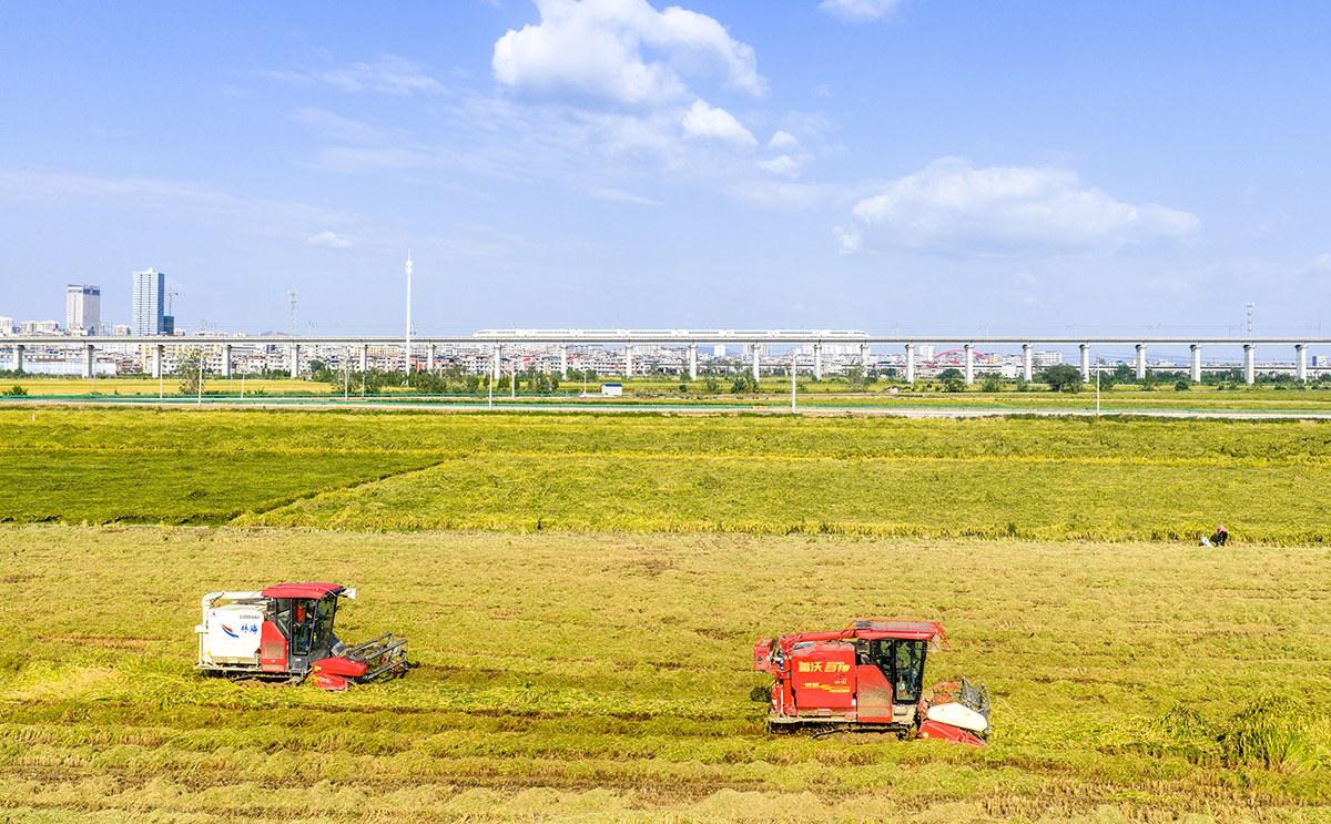 阳新十里湖片区水稻田里,农民抢抓晴好天气忙着收割。