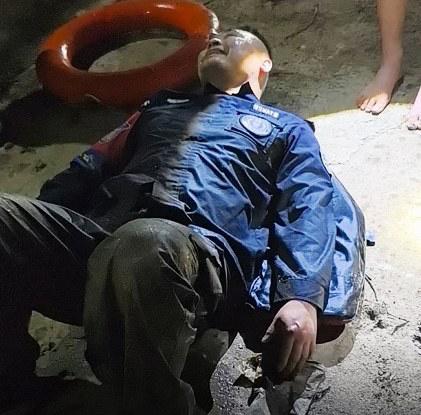 费了九牛二虎之力,张智勇和冯明轩来到了落水男子的身边。经过查看,二人发现落水男子的双腿插在了淤泥中,且体力已经耗尽,仅凭他个人无法脱困。于是,张智勇和冯明轩让落水男子的上半身趴在救生圈上,慢慢将他从淤泥中拔出。
