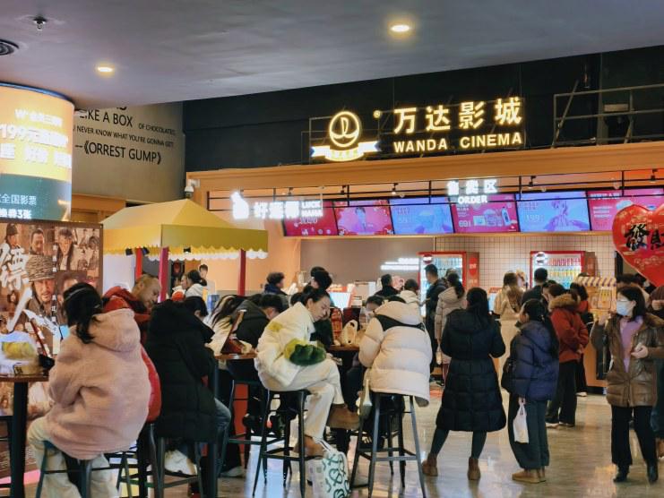大年初一傍晚,团城山万达影城人潮涌动。影院大厅内,购票机前、取票机前都排起了长队。