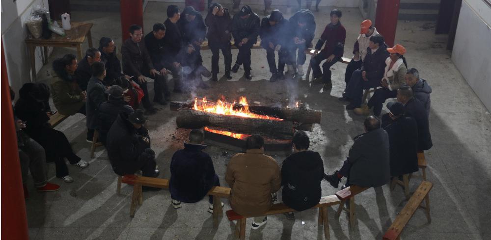 时间回拨到2月16日,农历除夕。傍晚的暮色悄然降临,港下陈湾却被一片温暖的红色点亮。湾内门楼上写有“义门第”三字的文化礼堂第二重中央,一堆熊熊燃烧的篝火正旺。跳跃的火苗照亮了四周古朴的梁柱,也映红了乡亲们的脸庞。